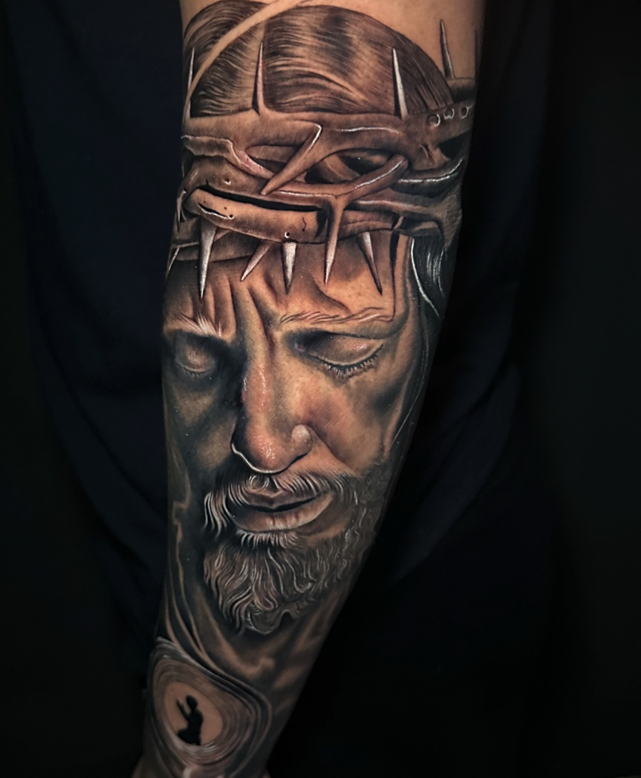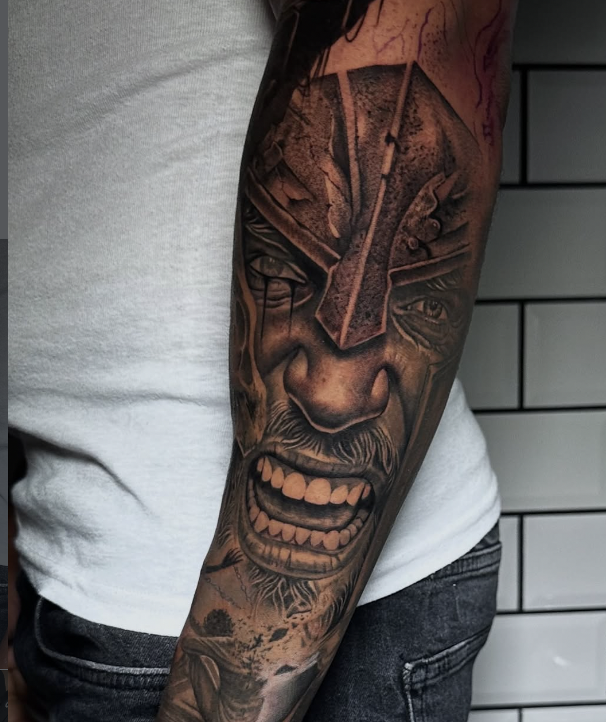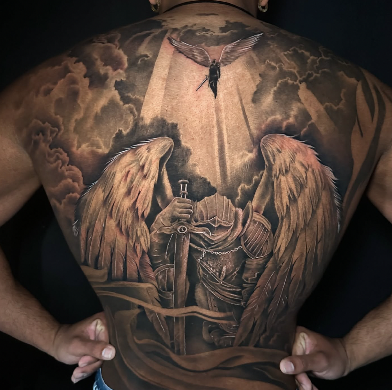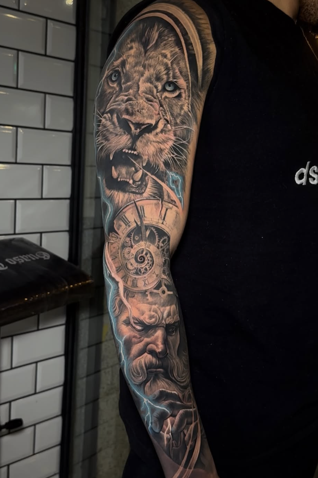 Su sello es la precisión en la ejecución. El control del detalle, la lectura limpia de volúmenes y una composición pensada desde la base hacen que cada pieza funcione tanto en el momento de hacerse como años después, cuando el tatuaje ha asentado y sigue luciendo sólido, equilibrado e impecable.