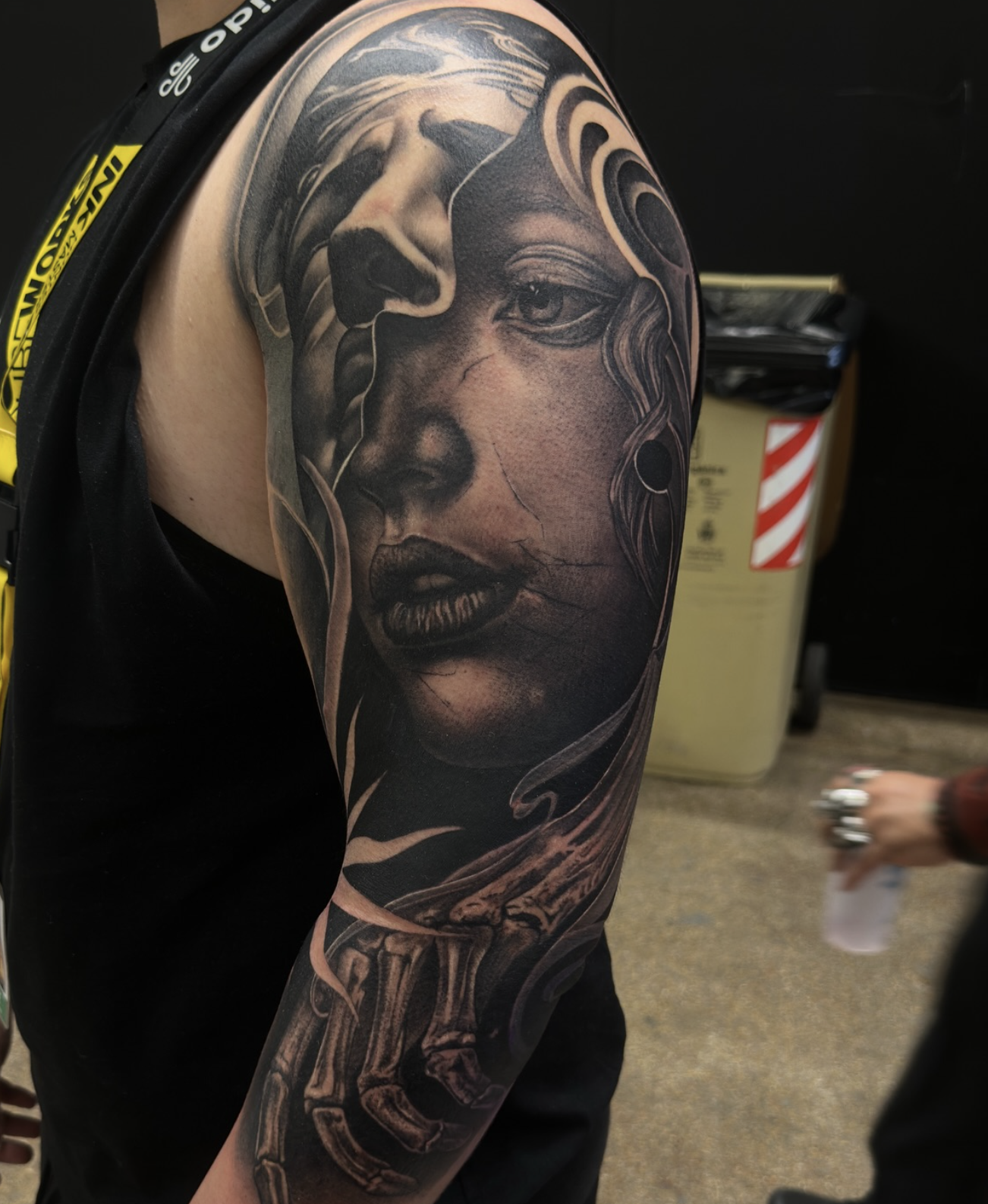 Erickjink es tatuador especialista en realismo en negro y gris, con base en Santa Carla Tattoo Parlour, uno de los estudios de tatuajes más exclusivos de Barcelona. Un entorno de alto nivel artístico que no es casual: refleja exactamente el estándar que Erickjink aplica en cada uno de sus trabajos.